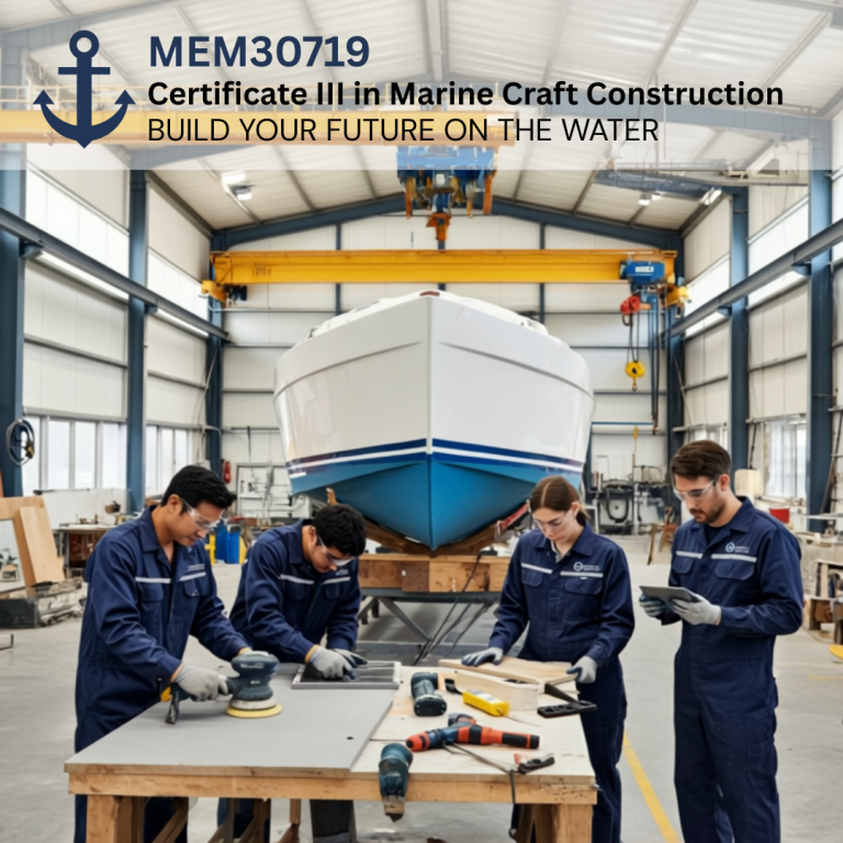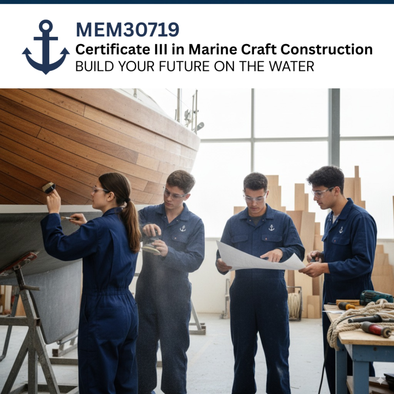 The MEM30719 Certificate III in Marine Craft Construction is a nationally recognised qualification designed to equip students with the technical knowledge and practical skills required to become a skilled tradesperson specialising in the construction, repair, and maintenance of boats. This course focuses on working with materials such as aluminium and steel, covering key aspects of marine craft construction, including fabrication, welding, fitting out internal and external components, and installing engineering drive systems. This qualification prepares students for a rewarding career as a shipwright or boat builder in Australia’s world-class marine industry, known for its high-quality manufacturing standards.